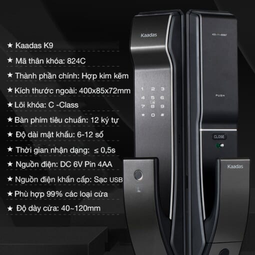 - Như các dòng khóa cửa khác của Kaadas, K9 sử dụng công nghệ vân tay bán dẫn FPC Thụy Điển độ bảo mật cao, độ nhạy lên tới 0,05s.