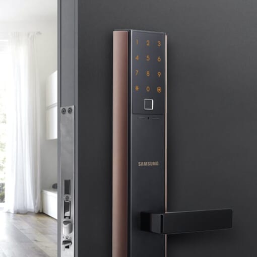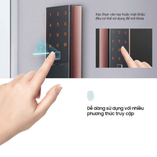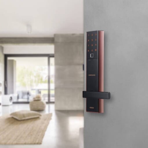Khóa vân tay Samsung DH538 với thiết kế màu đỏ đồng phù hợp với các căn hộ sang trọng. Công nghệ quét vân tay cảm ứng điện dung và mã số ngẫu nhiên, cùng hệ thống cảnh báo đột nhập sẽ đem lại sự an toàn và tiện lợi đến căn hộ của bạn.